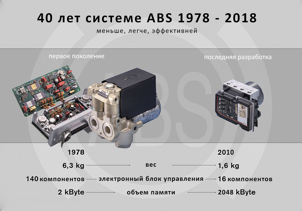 Так, в первом поколении ABS фирмы Bosch, разработанном в 1970 году, насчитывалось порядка 1000 электрокомпонентов, а к восьмому поколению, выпущенному в 2003 году, их осталось всего 16.