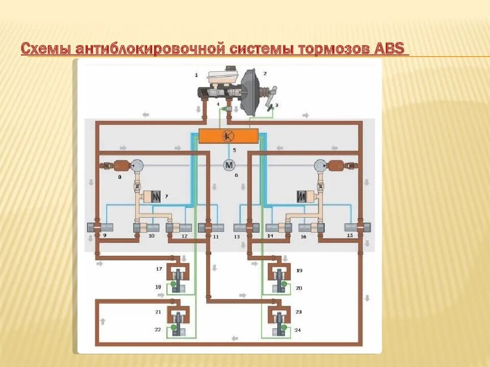 - двухканальная (в этом типе АБС тормозные механизмы разделили по бортам, для каждого из которых предусмотрены свой комплект клапанов. То есть, один канал объединял в себе механизмы переднего и заднего колес одной стороны);