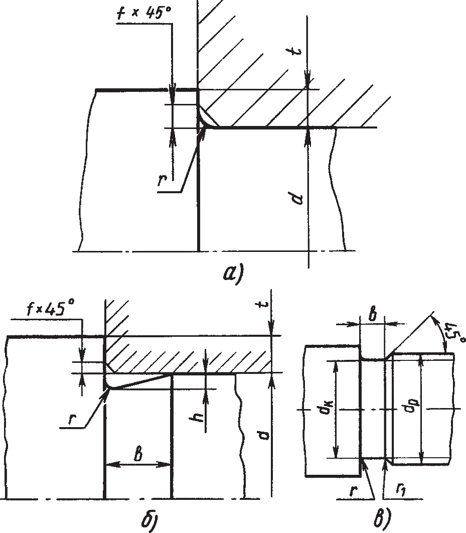 В местах изменения диаметра вала или оси делают переходы. Конструктивно они должны быть выполнены так, чтобы прилегание детали к буртику или торцу переходной поверхности было плотным, без зазора. Если переход от цилиндрической поверхности к вертикальной торцевой поверхности буртика или к торцу переходной поверхности выполнен по радиусу, то такой переход называют галтелью (рис. 7, а), а если с проточкой, в виде канавки, то называют поднутрением (рис. 7; б, в).