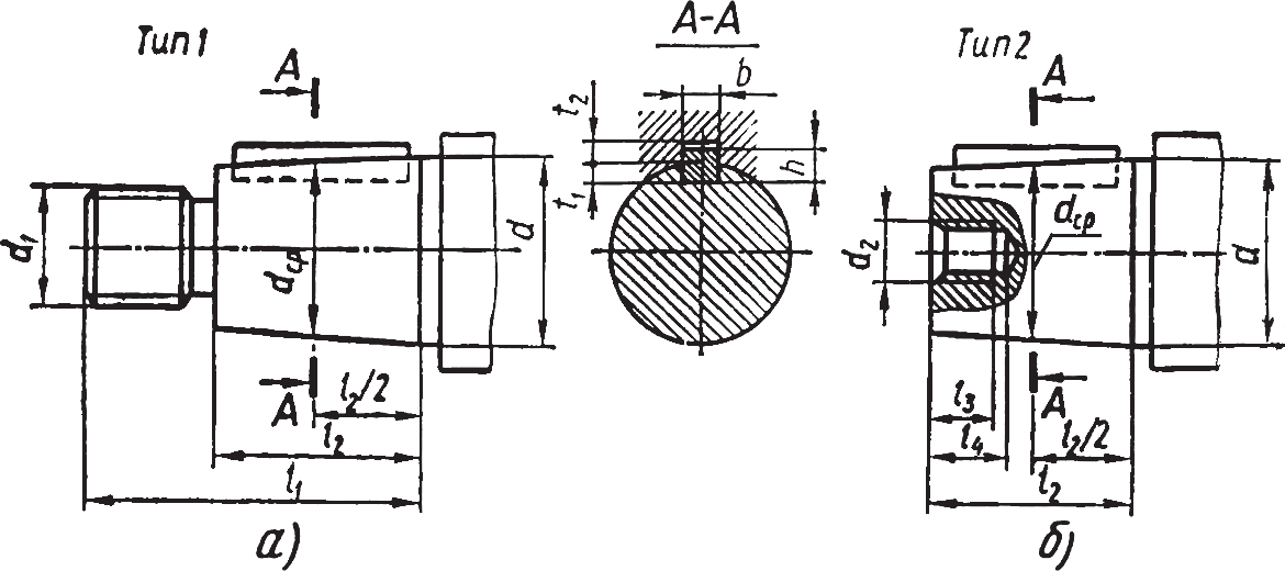 Концевые участки валов выполняют цилиндрическими (рис. 4) или коническими (рис. 5). Посадка деталей на конус обеспечивает легкость сборки и разборки, высокую точность базирования, возможность создания любого натяга. Поэтому консольные концы валов редукторов серийного производства, как правило, делают конусными. Поскольку цилиндрические концы валов проще в изготовлении, то при единичном и мелкосерийном производствах они имеют преимущественное распространение.
