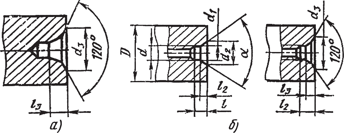 На торцах валов располагают центровые отверстия с углом конуса α=60° (рис. 6), которые используют в качестве технологических баз при изготовлении валов и осей и при проверке погрешностей, которые образуются при обработке и эксплуатации валов и осей (а), а также применяют для монтажных работ, транспортирования и хранения в вертикальном положении (б). Фаска под углом 120° защищает резьбу и конусную поверхность центрового отверстия от забоин (см. в конце табл. 1).