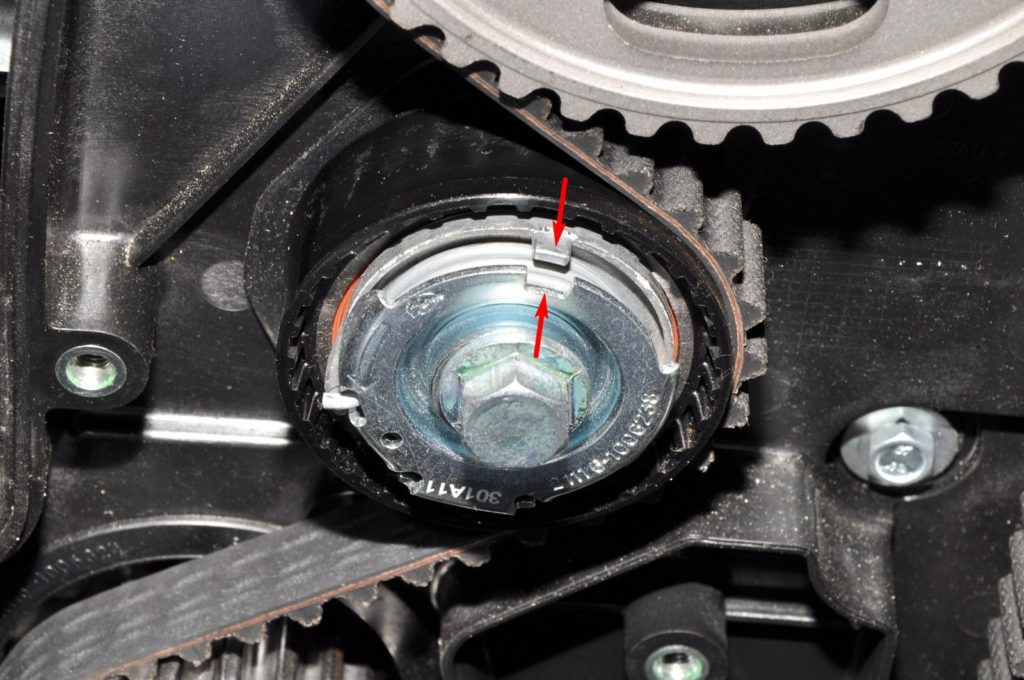 - При установке нового натяжителя необходимо следить, чтобы паз на двигателе совпал с выступом на ролике.