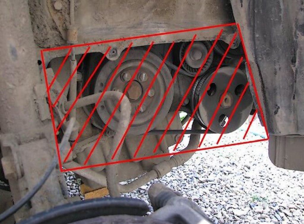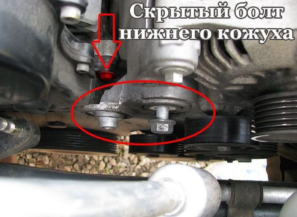 Откручивайте до момента, пока ремень не провиснет. После чего необходимо скинуть ремень с нижних роликов. При необходимости снимите пластиковые щитки на днище авто. Вытащить ремень можно просто сверху из-под капота.