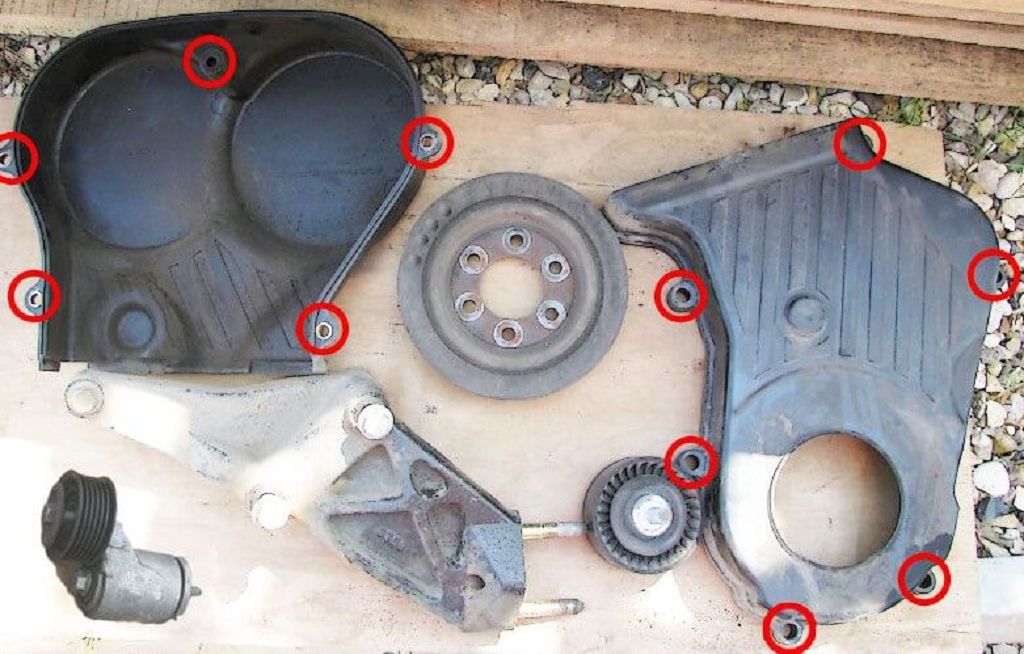Примечание: На рисунке ниже кругами отмечены места расположения пяти болтов крепления верхней крышки ремня привода ГРМ.