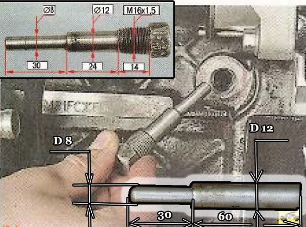 В нижний коленвал необходимо вставить фиксирующий болт, но подойдет любой штырь, главное следить, чтобы он не провалился в отверстие. Поворачивайте коленвал до тех пор, пока штырь/болт не зайдет внутрь, тем самым не зафиксирует коленвал. На схеме ниже вы можете посмотреть место установки штыря и размеры для самостоятельного изготовления. Оригинальный фиксатор имеет каталожный номер CH-20003 и неадекватную стоимость.