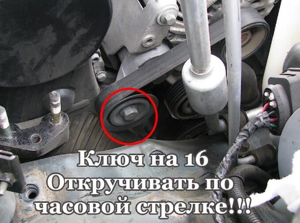 Накидной ключ на 16 одевается на гайку ролика натяжителя, после чего необходимо с усилием отодвинуть ролик от себя и снять ремень.