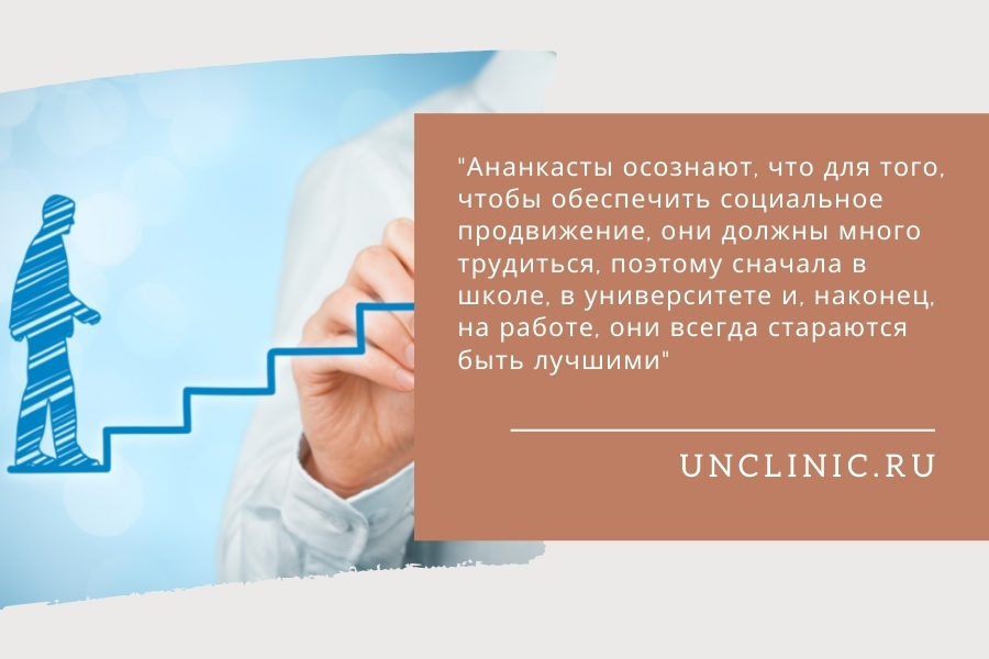 Ананкасты осознают, что для того, чтобы обеспечить социальное продвижение, они должны много трудиться, поэтому сначала в школе, в университете и, наконец, на работе, они всегда стараются быть лучшими. Такое постоянное состояние вызывает усталость и раздражительность, тем более что зачастую семья не в состоянии оценить все усилия больного.