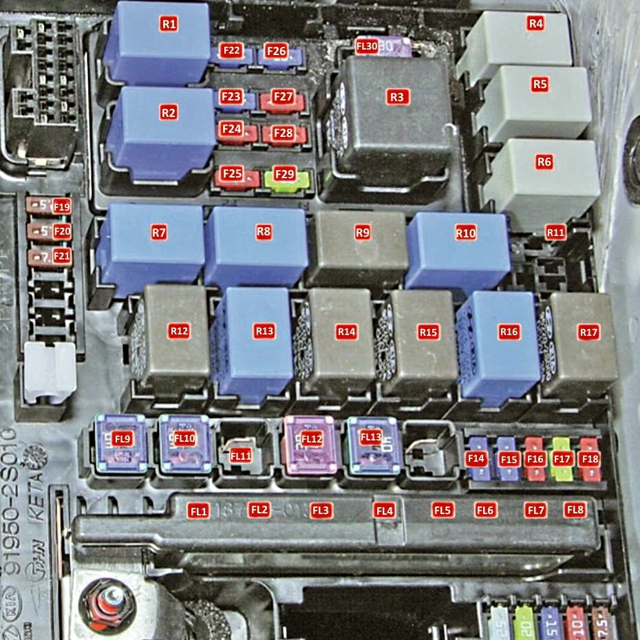 | 28 | 10A Instrument cluster, generator, climate control unit, audio / video and navigation unit, parking aid switch, driver and passenger seat heating switch, BMC, tire pressure monitoring module, RAV and SBR lamp |