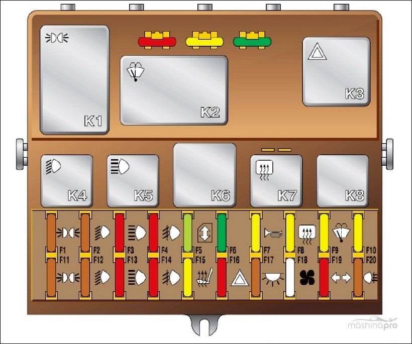 Примечание 1. На корпусе монтажного блока указаны порядковые номера и номинальный ток предохранителей. Назначение реле и защищаемые предохранителями цепи обозначены условными символами.Примечание 2. В зависимости от комплектации автомобиля сверху на монтажный блок могут быть установлены реле включения дополнительного оборудования.