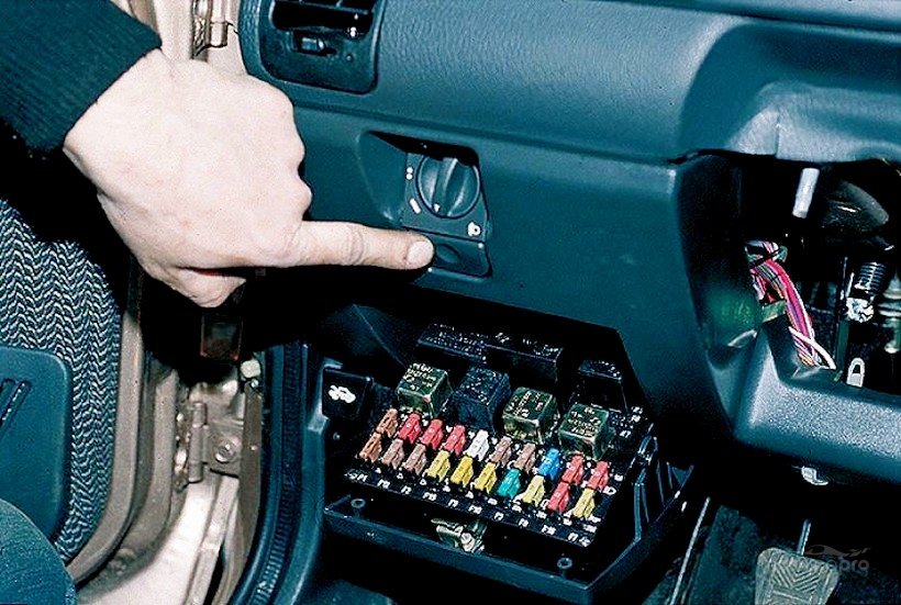 Он же монтажный. Во всех версиях ВАЗ десятого поколения и выше находится слева от рулевой колонки, под переключателем фар. Чтобы его открыть, достаточно потянуть пластиковую защелку. Крышка опускается вниз и все элементы доступны для замены. Если приходится работать на морозе в непрогретой машине, выковыривать маленькие предохранители неудобно, поэтому лучше снять блок целиком. Для этого: