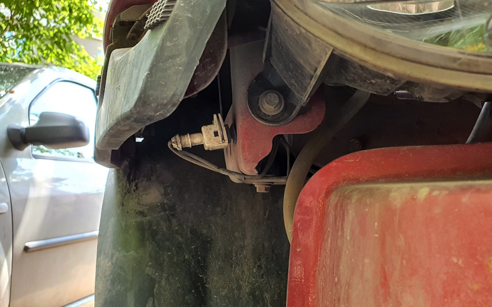 А с правым сигналом меня ждал сюрприз, а именно отсутствие его на положенном месте. До сих пор, я был уверен, что на дорестайлах сигналы было всегда справа и слева, а один-единственный появился уже на рестайле. Но оказалось, что два сигнала было только на ранних дорестайлах. Так что, вместо второго сигнала меня встретил лишь разъём под него, аккуратно воткнутый в специальную заглушку на кронштейне крыла.