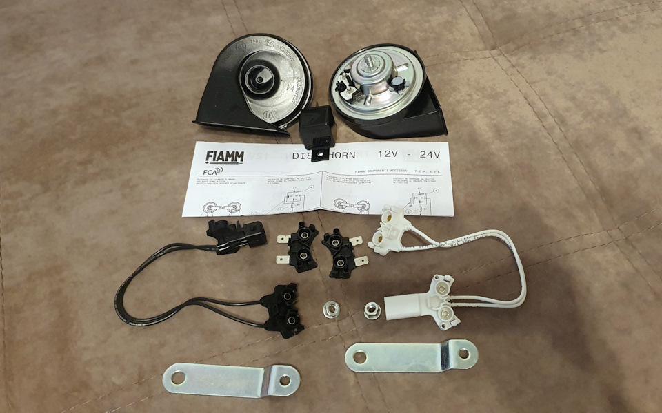 Комплект для установки, конечно богатый — два самих сигнала, кронштейны для них с гайками, переходник под старый квадратный разъём, переходник под новый округлый разъём, два переходника под клеммы 6,3 мм, релюшка и листок с инструкцией.