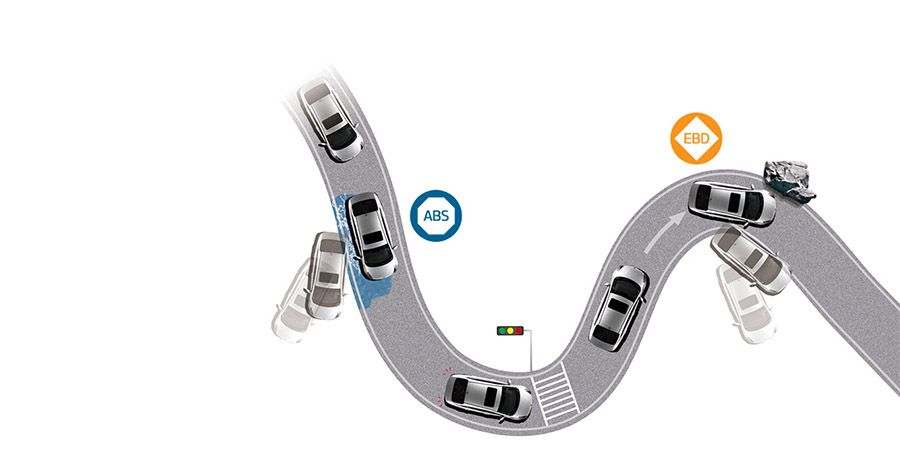 EBD отлично срабатывает как в процессе движения по прямой, так и при торможении во время прохождения крутого поворота. В первом случае равномерное распределение тормозных усилий происходит между колесами передней и задней оси, а во втором – между колесами с левой и правой стороны.