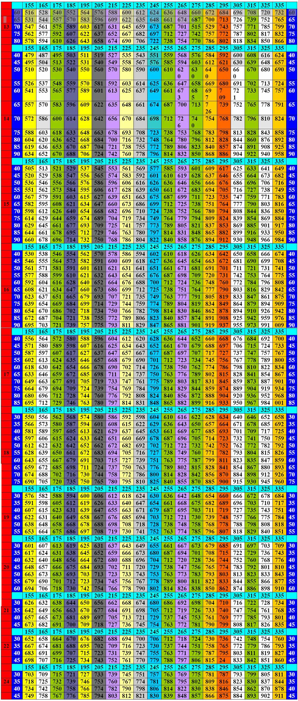 Смотрим таблицу в первой колонке ищем сектор на 15 дюймов, в колонке 195 ищем цифру ближайшую к нужной нам (614).