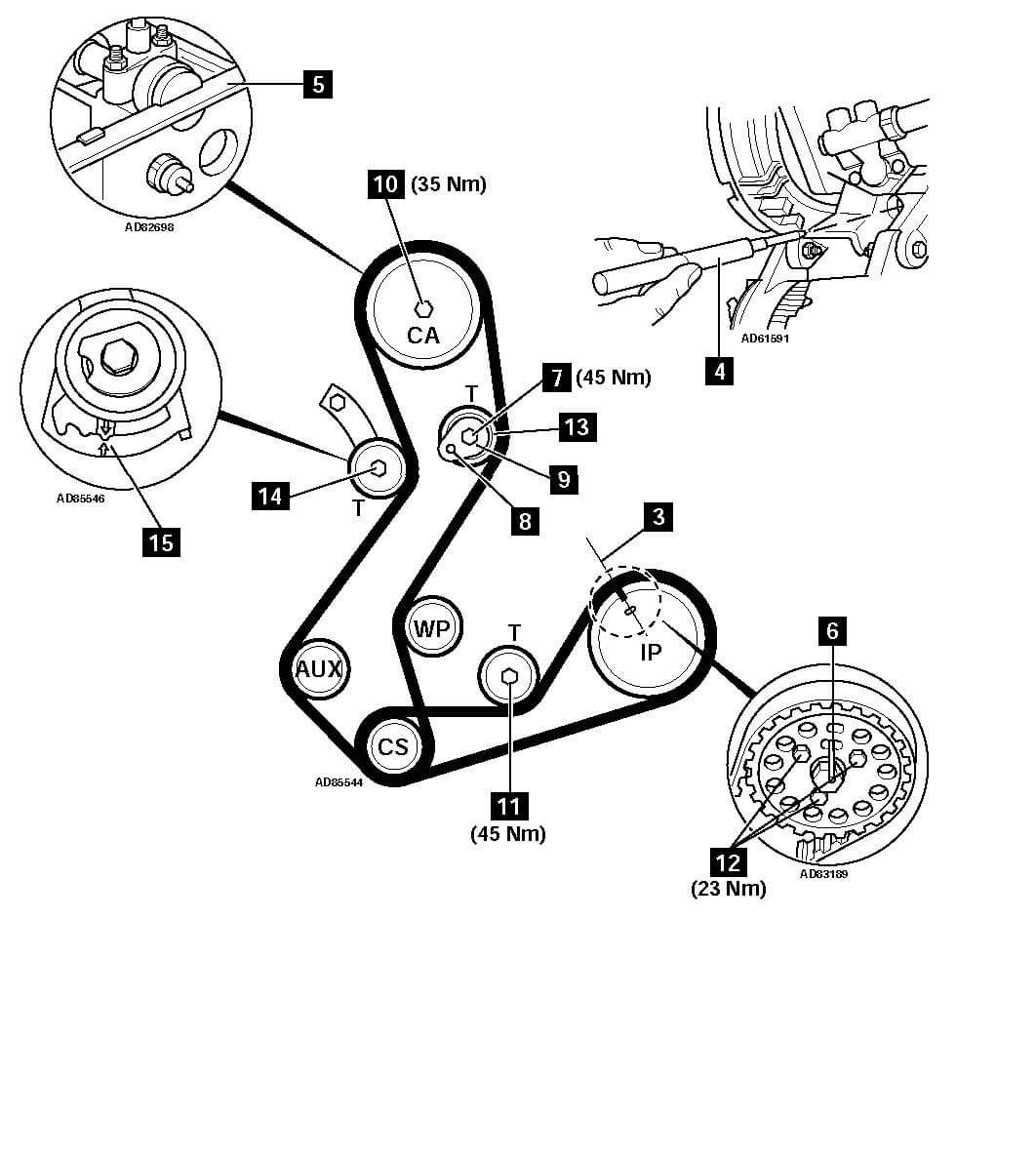 Зафиксировать натяжной ролик в положении, обеспечивающем минимальное натяжение ремня. Самая ответственная операция — установка нового ремня. Необходимо обеспечивать максимальное натяжение правой ветви ремня от шкива коленвала через помпу и направляющий ролик к шкиву правого, а затем и левого распредвалов и совмещение меток коленвала и обоих шкивов с соответствующими ответными метками.