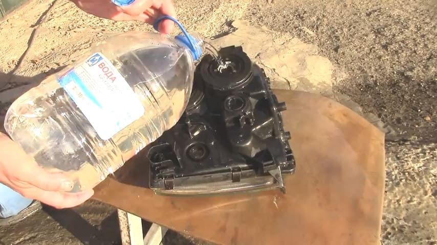 Поскольку обычная вода содержит соли, мелкие включения и другой микроскопический мусор, блок требует дополнительной очистки дистиллированной водой. Если этого не сделать, с внутренней стороны, как минимум, останутся разводы и следы солей. Поэтому, еще в мокрую фару заливается дистиллированная вода, взбалтывается и сливается. Процедуру рекомендуется повторить трижды.