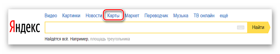 Чтобы узнать о возможностях Яндекс.Карт, ознакомьтесь с дальнейшими инструкциями. Для перехода к сервису на главной странице Яндекс кликните по строке «Карты» возле строки поиска либо напрямую перейдите по указанной ниже ссылке.