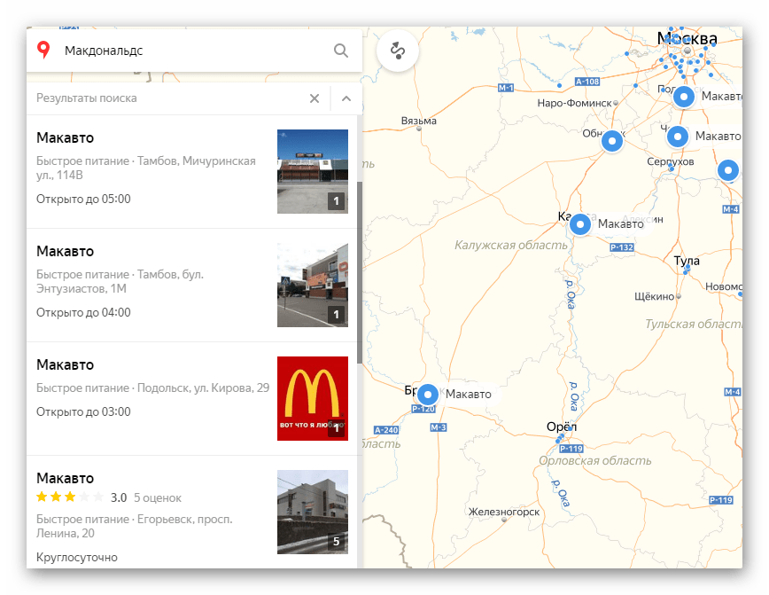 После ввода названия населенного пункта или конкретного адреса откроется расположение этого объекта на карте. Если указать, например, какой-либо магазин, появятся точки тех мест, где он присутствует. Слева вы увидите панель с подробной информацией, включающей фотографии, комментарии посетителей и адреса во всех городах, где он присутствует.