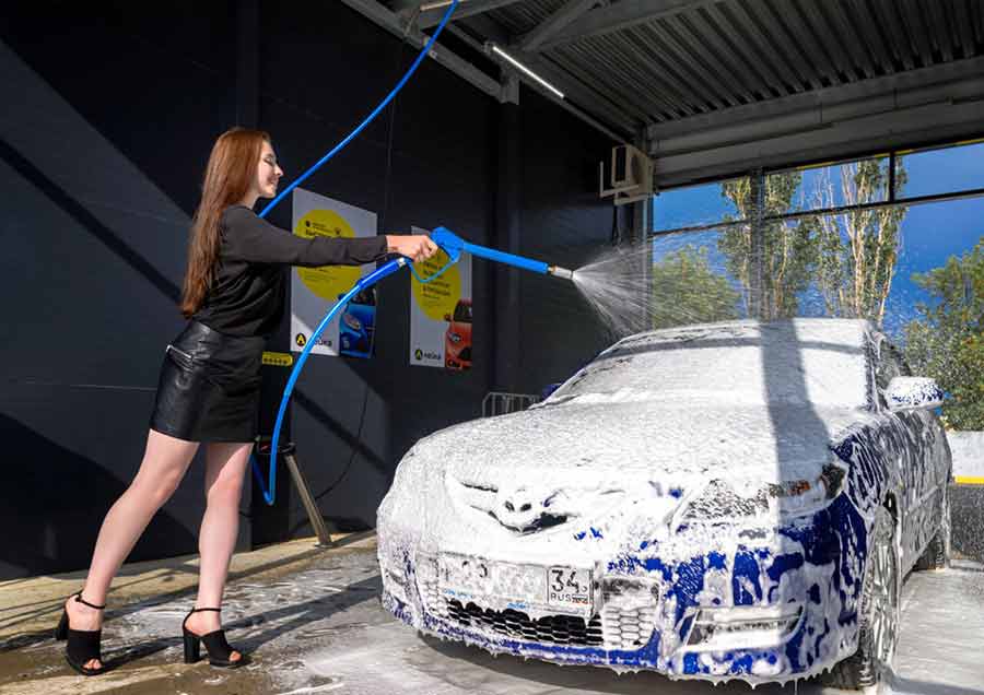 При использовании для мытья автомобиля автомоечной машины следует позаботиться о создании большого объема пены. Смывая пену, автомобилисты обычно не используют специальные насадки, так можно снизить давление воды и сохранить защитную пленку.
