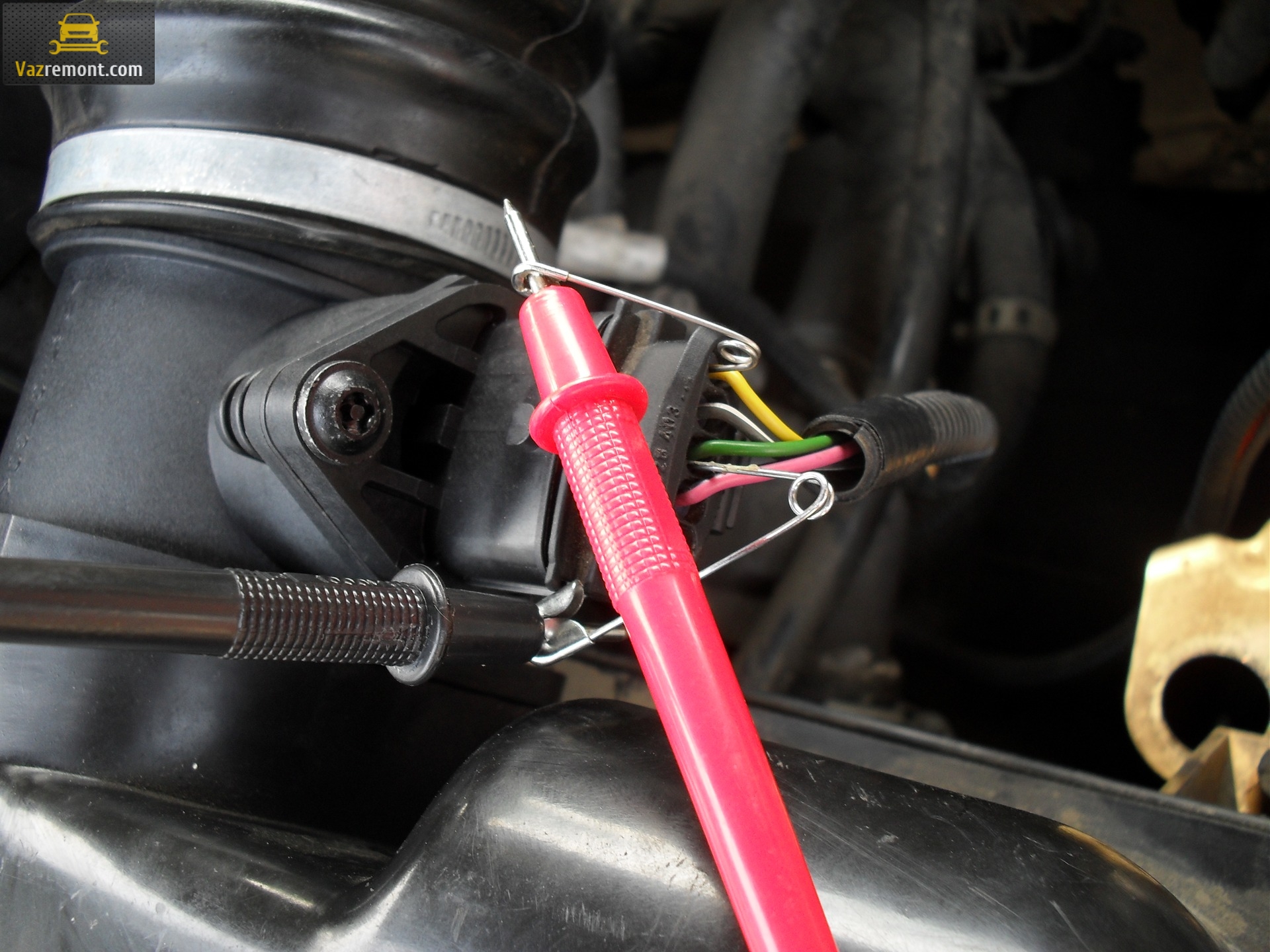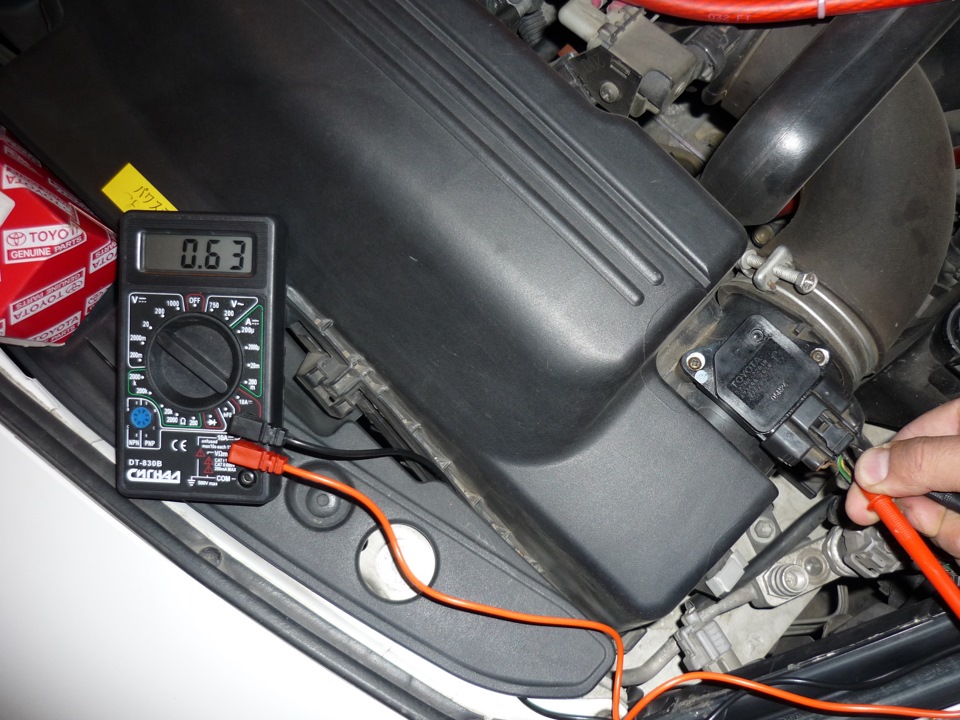 Наша задача измерить напряжение между двумя проводами со включённым зажиганием (Двигатель не заводить). Для профилактики щупы тестера можно смочить wd-шкой. Щуп можно засунуть сквозь резиновые уплотнители (благо размеры подходят) не нарушая изоляции проводов. Итак, мерим показания ДМРВ и смотрим результаты.