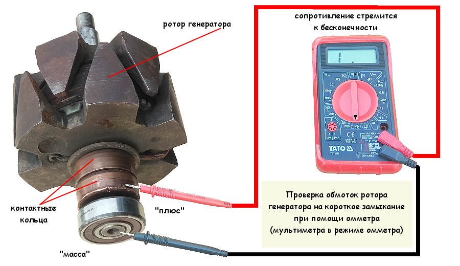 Обмотка якоря не должна явно пахнуть гарью. Цвет обмотки должен быть однородным, не иметь повреждений и разрывов. Для проверки обмотки якоря на обрыв понадобится мультиметр. Выставьте режим работы на прозвонку или замер сопротивления и подсоедините щупы к щёточным кольцам. Сопротивление обмотки должно быть в пределах 3−5 Ом. Затем один щуп оставьте на кольце, другой соедините с корпусом. Дисплей мультиметра должен показать бесконечность.