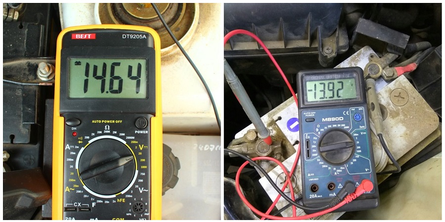 - Далее необходимо повторить этот же замер, только предварительно запустив двигатель. При 2000 оборотах, показания должны возрасти до 13,8-14,8 вольт.