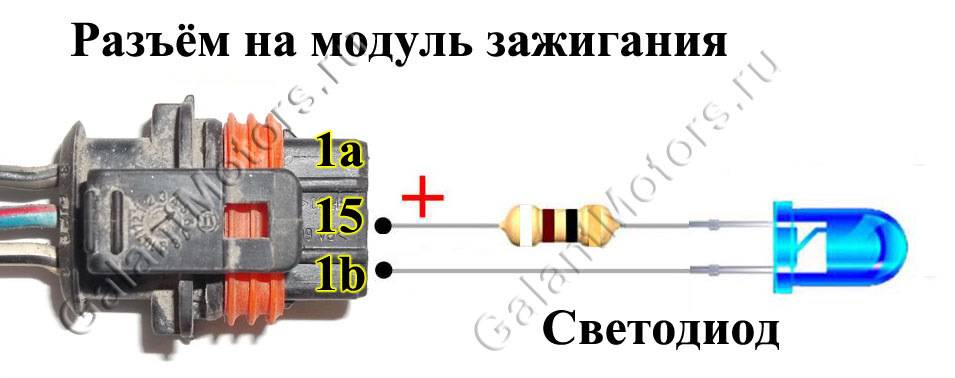 Для проверки, идёт ли импульс с ЭБУ на модуль зажигания можно использовать обычный светодиод с резистором (500…700 Ом). Подключаем в следующем порядке: