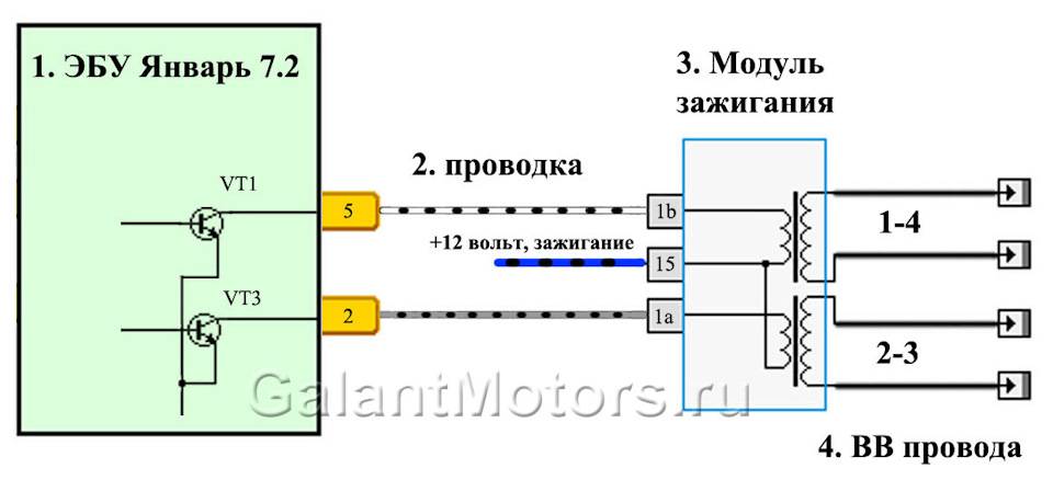 Модуль работает по принципу холостой искры — раздаёт искру попарно в 1-4 и 2-3 цилиндры согласно импульсам, передаваемым с ЭБУ.