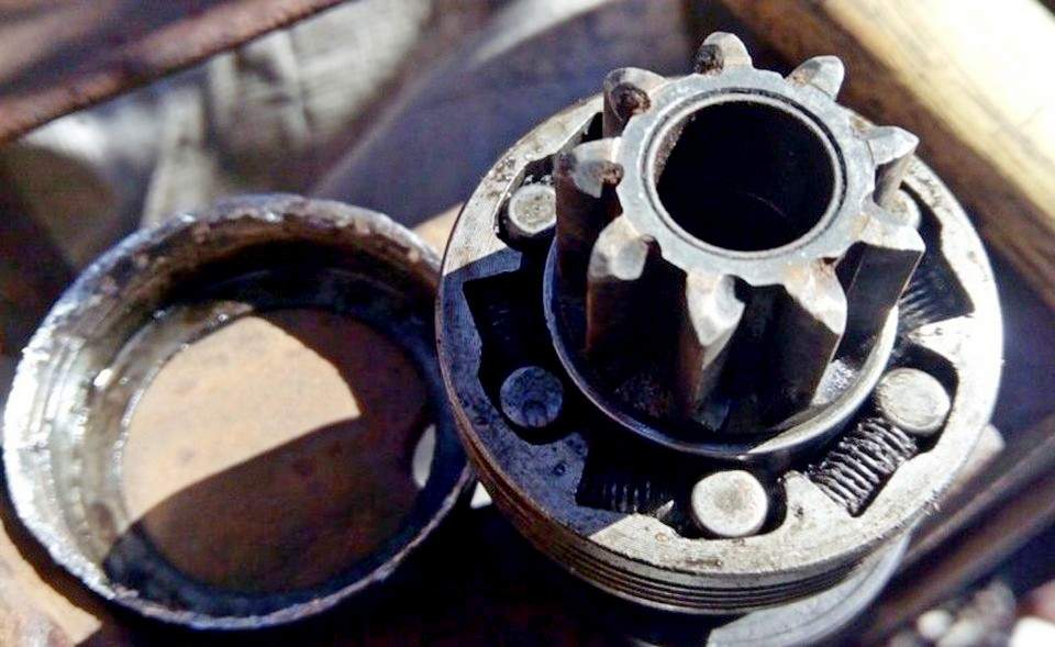 После снятия электродвигателя необходимо осмотреть бендикс (шестерня в самом конце), при наличии повышенного износа зубьев, трещин в нем – его следует заменить.