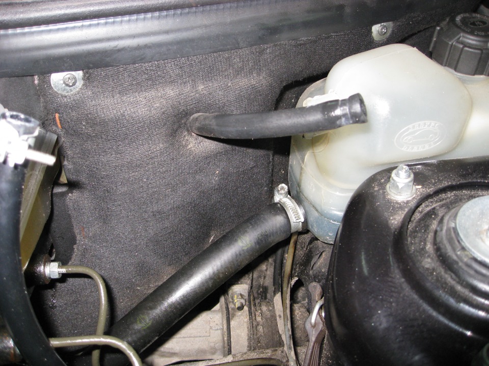 И заливая антифриз в расширительный бачок, нужно лить до тех пор, пока он не польется из этого отсоединенного шланга. Затем одеваем его на вывод и закручиваем хомут. Далее доливаем до необходимого уровня, и закручиваем пробку бачка.