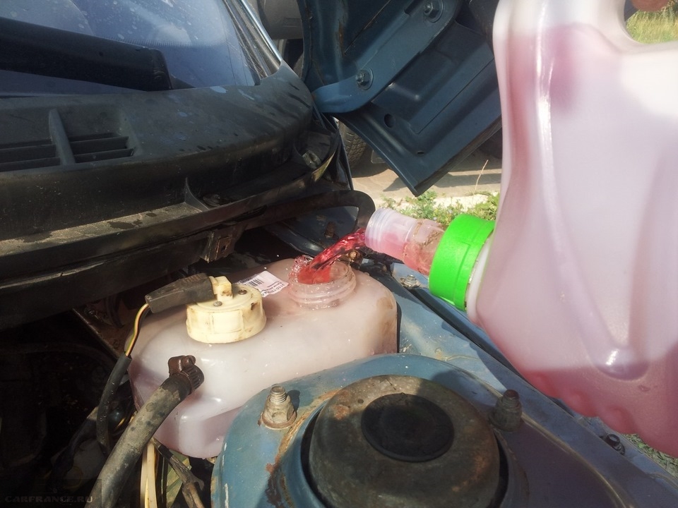 Заводим мотор и даем ему нагреться до тех пор, пока не сработает вентилятор охлаждения радиатора. Ждем, когда машина полностью остывает (на утро после замены) и смотрим на уровень жидкости в расширителе.