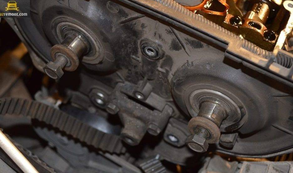 - Когда ремень демонтирован, необходимо снять 2 шкива распределительных валов. Во избежание их проворачивания, придерживаем их, откручиваем болты крепления и затем сами шкивы можно снять. (Не забудьте извлечь шпонки на пазах хвостовиков на валах – прим.).