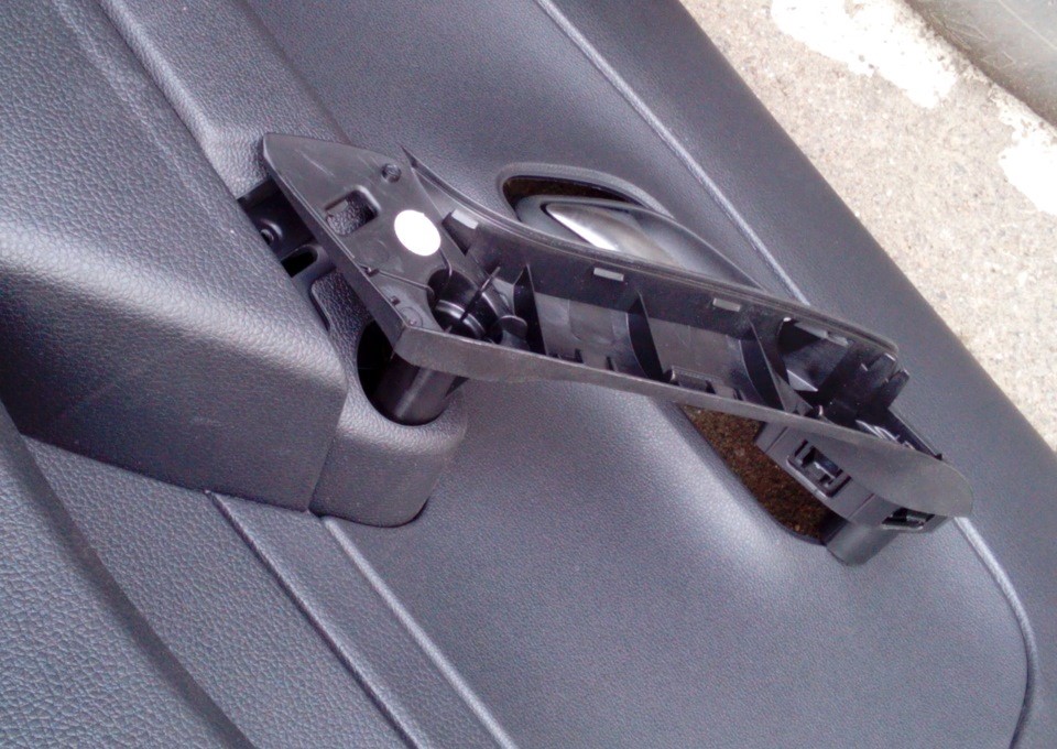 - Поддеть ручку открывания двери, отсоединить штекер тяги от рычага, вынуть из посадочного места.