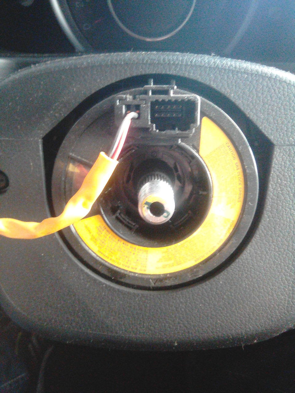одно из них которое будем считать самое верхнее, нам и нужно (в какое либо другое тыкать не имеет смысла, т.к. этим самым результата вы всё равно не добьётесь), в этом отверстие находиться один фиксатор подушки, всего их будет 3-и, нащупываем его и нажимаем на него отверткой. И что мы видим, после нашего удачного и точного нажатия на фиксатор, подушка с одной стороны отошла от своего посадочного места.Движемся далее…Выставляем руль в положение «прямо» и после этого поворачиваем его также на 90 градусов только уже вправо, и делаем все тоже самое что и с левой стороной, итог должен быть зеркален противоположной стороне (подушка должна отойти от своего посадочного места).Затем, поворачиваем руль к верх ногами (что бы шильдик KIA был к верх попой) и с обратной стороны руля в центре есть ещё одно отверстие и оно последнее, так же нащупываем фиксатор и нажимаем на него.Если вы все правильно сделали (по другому ну просто чисто физически не должно получится) то подушка должна сама «выпрыгнуть».P.S. слово «выпрыгнет» не воспринимайте буквально!И так, после первого этапа мы имеем подушку лежащую в руках.Саму подушку отключать НЕ НАДО! Её можно просто отвести в сторону, т.к. длина её шлейфа позволяет это сделать.Этап. 2. Поиск потайных креплений.Ну здесь уже будет попроще.