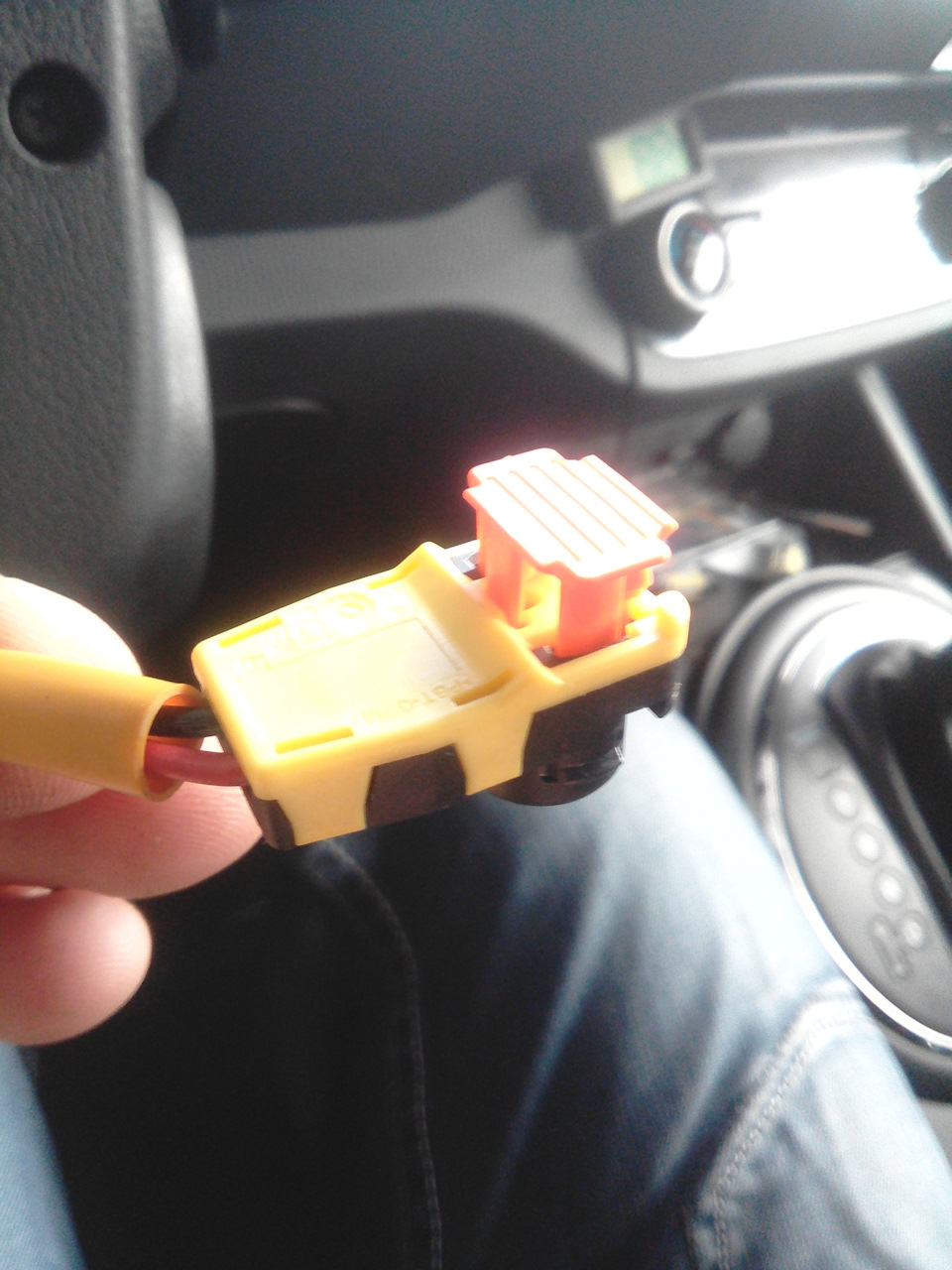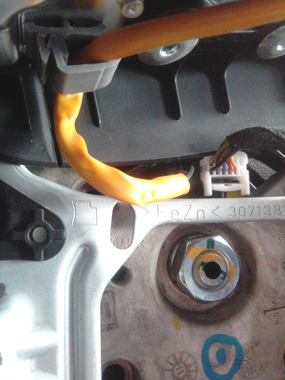 - Делаем демонтаж подушек безопасности. Находим намотанный спиралью шлейф. Отверткой отгибаем клипсу наверх.