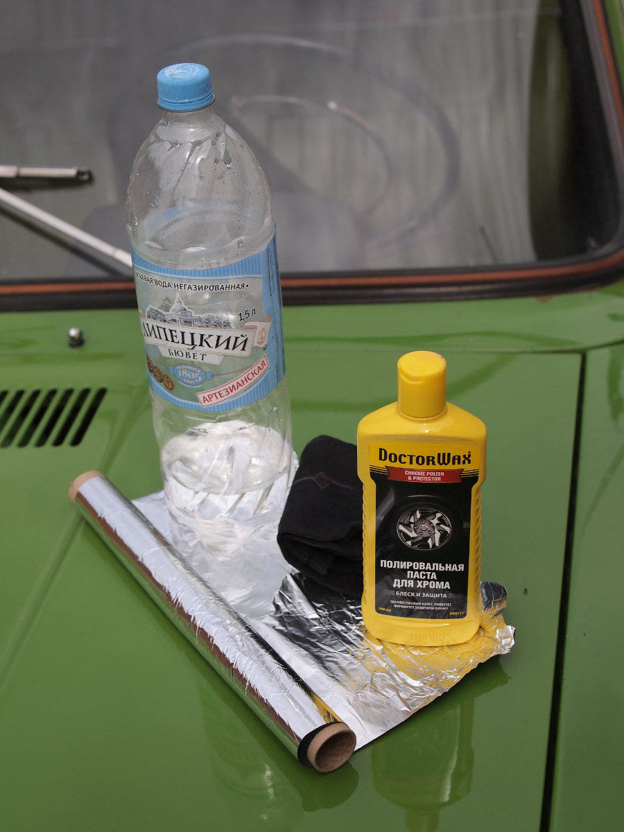 Для очистки и восстановления хромированного покрытия потребуется специальное средство, которое продаётся в автомагазине или домашние средства, которые перечислены ниже.
