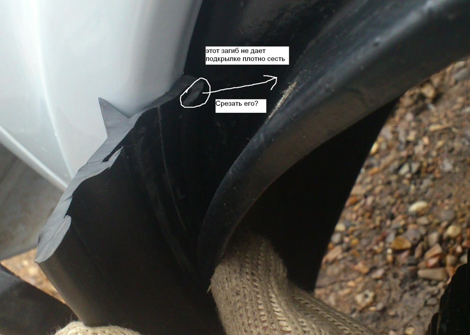 Провести установку не снимая колес практически невозможно. Процедура снятия и установки брызговиков описана в других разделах данного портала. Отвинтить крепления декоративной пластмассовой арки, если она имеется. Открутить винты и крепежные гайки пластмассового элемента, отделяющего пространство между передней частью колесного углубления и бампера. Поставить подкрылок передний в колесное пространство и совместить все крепежные отверстия.
