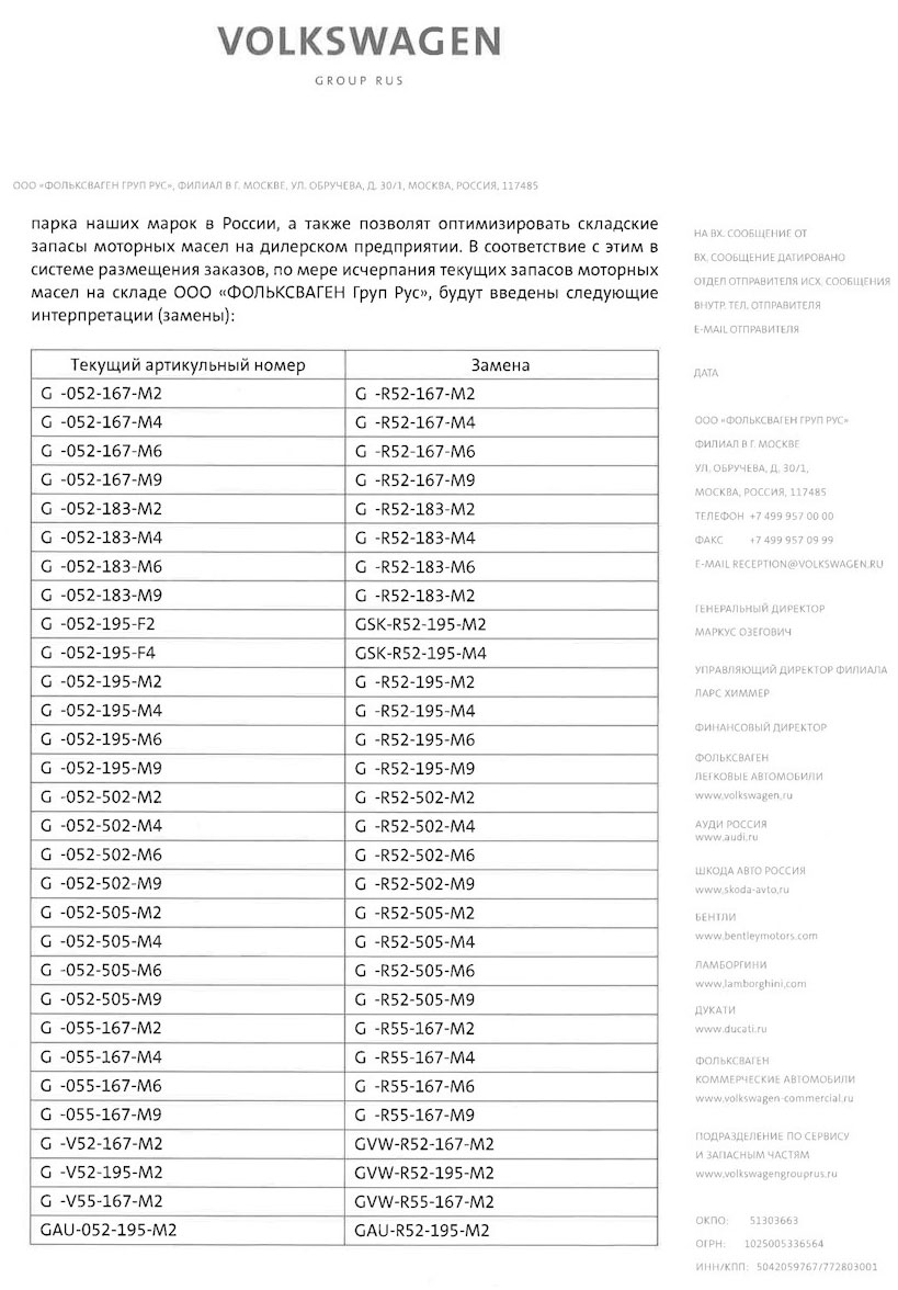Примечание: При эксплуатации бензиновых автомобилей на территории Российской Федерации VAG официально рекомендует заменить масла с допусками 504.00507.00 на масла с допуском 502.00505.00 с рекомендованными вязкостями SAE 0W-30, 5W-30, 0W-40, 5W-40. Наиболее предпочтительная вязкость 0W-30.