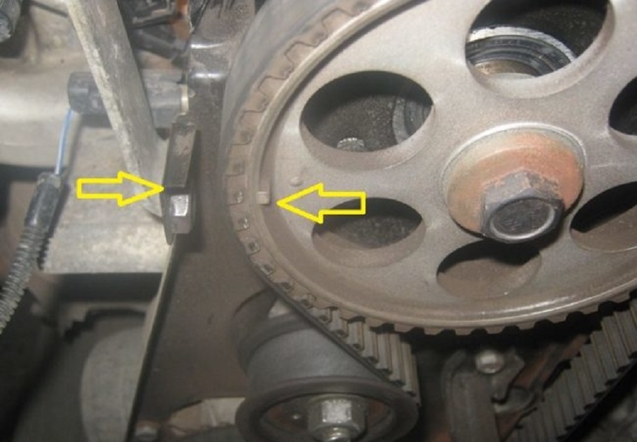 - Затем коленвал проворачивается на полтора-два оборота, и выставляются метки. Если они не совпадают, ремень опять снимается и устанавливается заново.