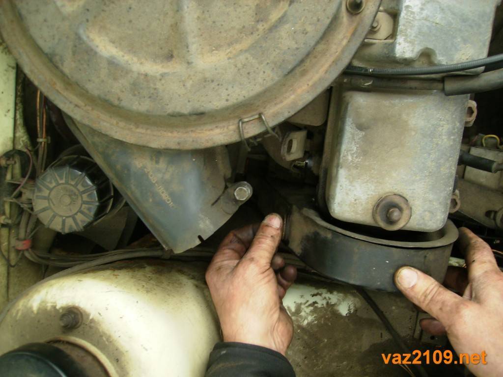 Итак, приступаем непосредственно к замене ремня ГРМ на девятом семействе. Поднимаем капот и первым делом снимаем терморегулятор с воздушного фильтра и откручиваем болты крепления кожуха ГРМ