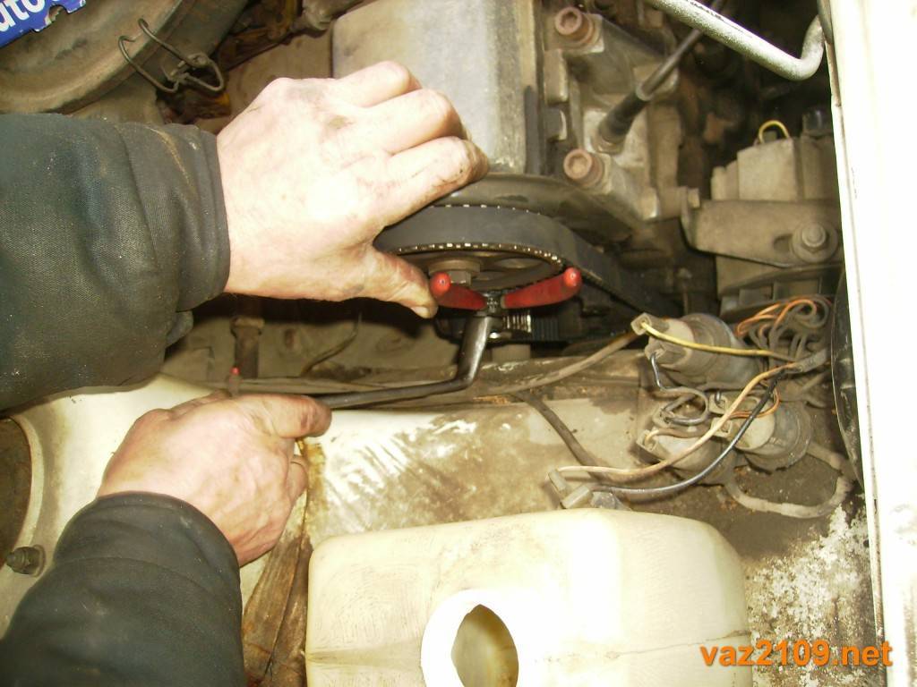 - Убираем ременной привод ГРМ со шкива распределительного и коленчатого вала.