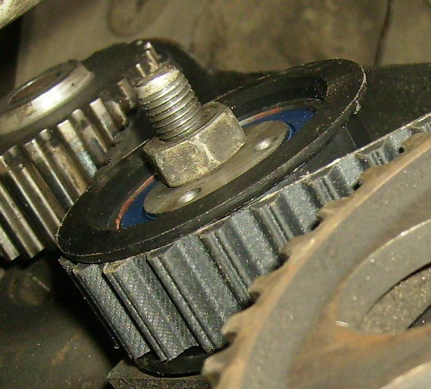 Прежде всего необходимо заменить натяжной ролик на новый. Поэтому устанавливаем дистанционную шайбу. Сам ролик и притягиваем ролик крепёжной гайкой.