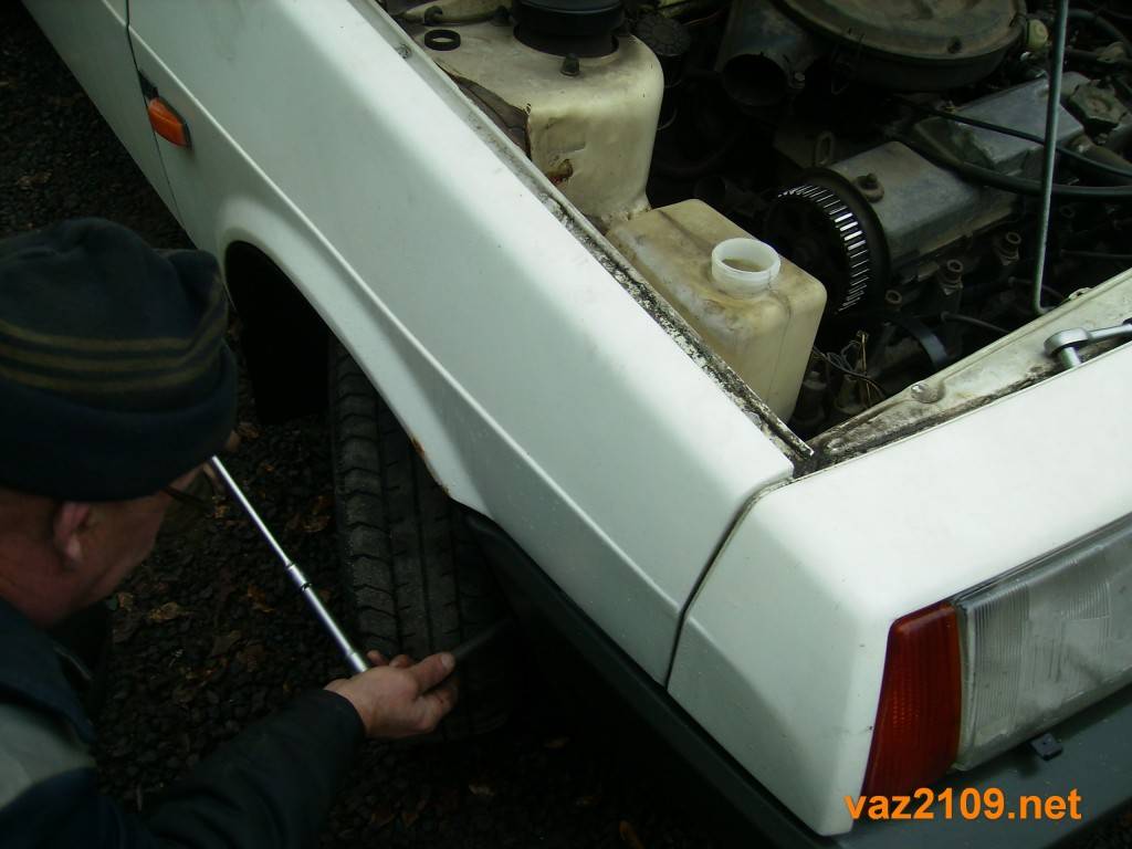 - Срываем крепления на правом колесе и поднимаем автомобиль домкратом так, чтобы колесо свободно снималось.