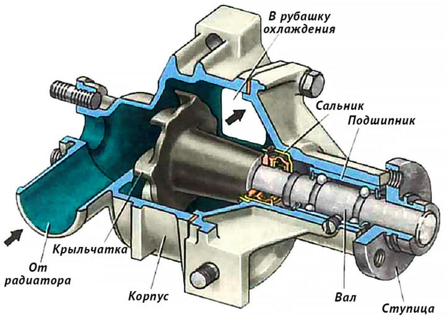 Водяная помпа создаёт давление антифриза в охладительной рубашке мотора. В сущности, это обыкновенный центробежный насос, давление в котором создаётся стальной крыльчаткой, которая постоянно вращается с огромной скоростью.