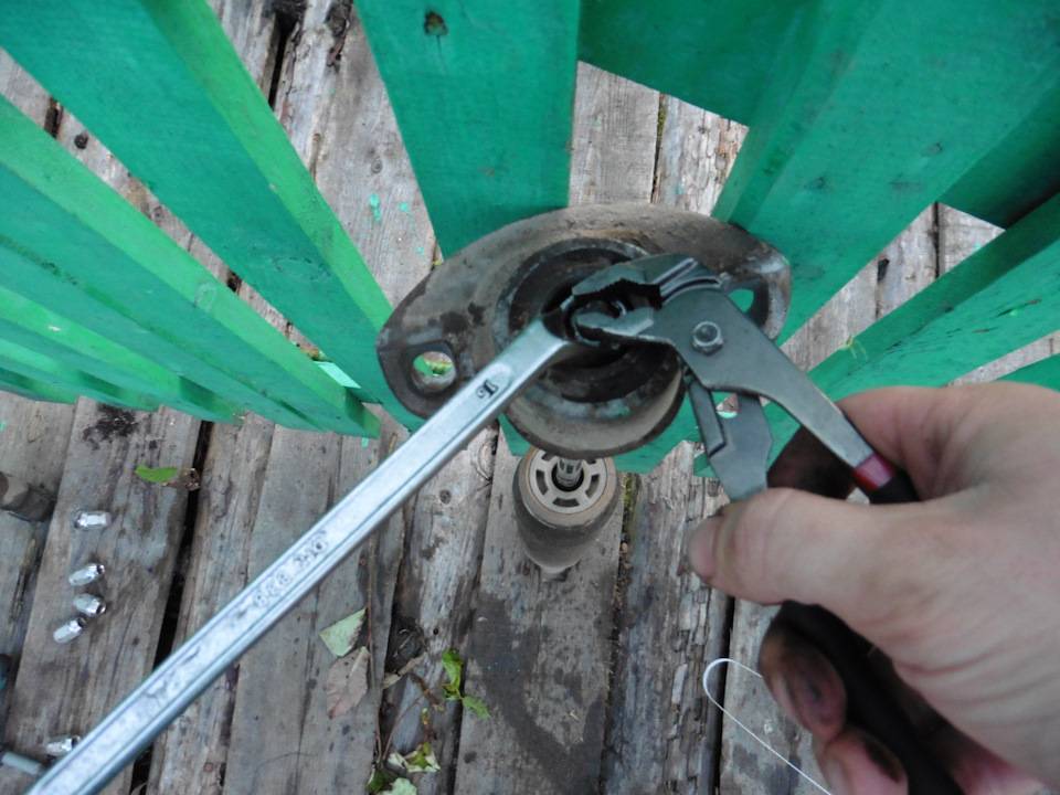 4. Ключом «на 15» откручиваем гайку крепления стойки и удерживаем ключом «на 5,5» (либо пассатижами) шток от проворачивания;