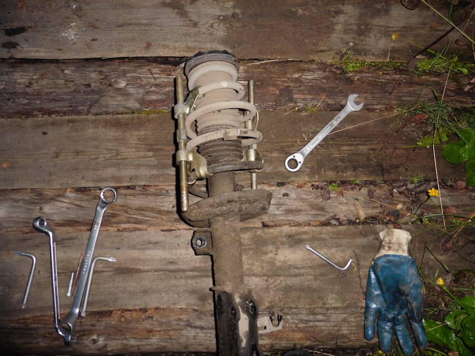 8. После стяжки пружин выкручиваем вторую гайку «на 24» от опорного подшипника и удерживаем шток звёздочкой «на 50»;9. Прокачиваем новый аморт;10. Перекидываем на новый амортизатор пыльник, отбойник и пружину;11. Одеваем опорный подшипник и закручиваем гайку «на 24» удерживая при этом шток звёздочкой уже «на 45»;12. Собираем все в обратной последовательности, за исключением того что верхнюю гайку опоры закручиваем ключом «на 22» и удерживаем звёздочкой «на 45».