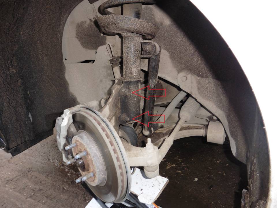 4. Откручиваем ключом «на 18» две нижних гайки крепления амортизатора к поворотному кулаку и вытаскиваем болты;
