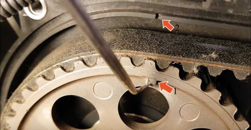 Вверху также проверяем метки, зуб № 1 на шкиве распределительного вала должен соответствовать углублению № 2.