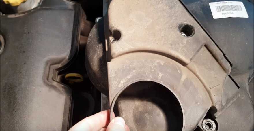 Снимаем кожух. Подводим шкивы распредвала к меткам на задней стенке кожуха.