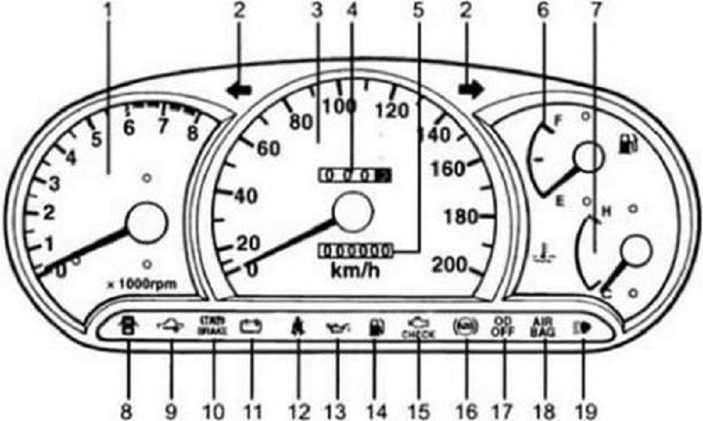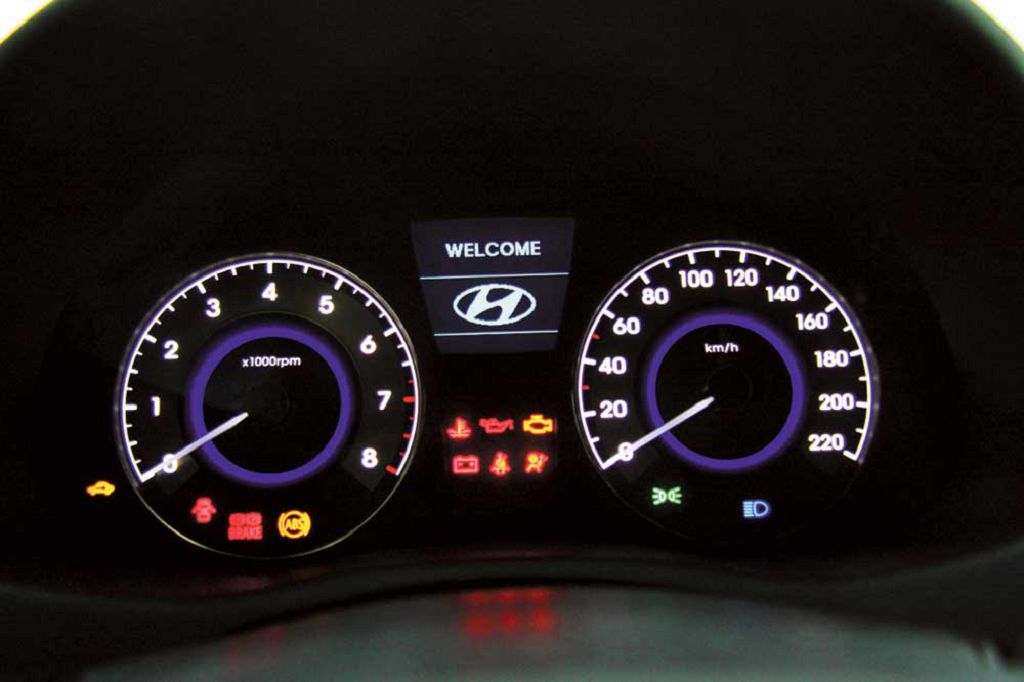 Отличительной особенностью щитка приборов Hyundai Accent являются шкалы большого диаметра. За счёт этого облегчается восприятие показаний. Сигнальные индикаторы располагаются в нижней части панели в один ряд.